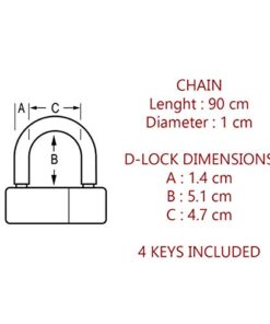 - SPECIFICATIONS: Chain (L x Diameter) 90 x 1 cm ; mini U lock (A x B x C) 1.4 x 5.1 x 4.7 cm ; four keys included